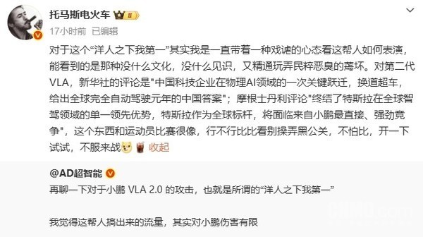 【CNMO科技消息】近日股票配资的正规平台,小鹏汽车在其VLA 2.0技术全面推送前夕,陷入一场舆论风波。该技术被部分网友贴上“洋人之下我第一”的标签进行嘲讽,意指其只敢在国内称雄,面对国际领先者则显怯懦。对此,小鹏汽车副总裁于涛(微博账号@托马斯电火车)在社交平台作出正面回应。