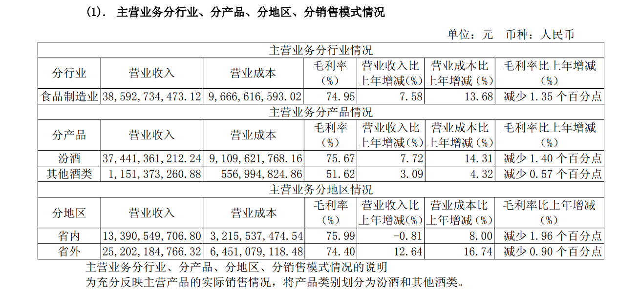 此外,按地区划分,去年,山西汾酒省内实现营收133.91亿元,同比下降0.81%;省外营收252.02亿元,同比增长12.64%。分渠道来看,直销、团购、电商期内销售收入为25.00亿元,同比增长6.89%;批发代理销售收入为360.93亿元,同比增长7.62%。
