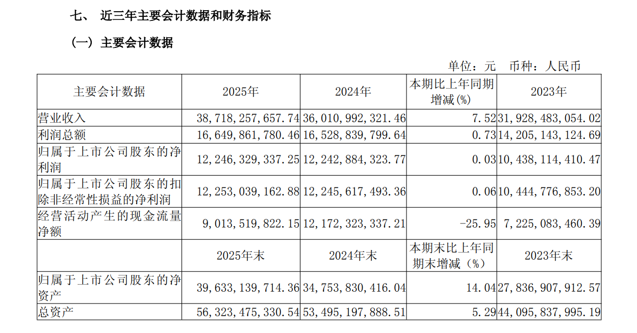 4月22日晚间,山西杏花村汾酒厂股份有限公司(山西汾酒,600809.SH)发布2025年年度报告,报告期内,公司实现营业收入387.18亿元,同比增长7.52%;归母净利润122.46亿元,同比增长0.03%。公司拟向全体股东每10股派发65.60元现金股利(含税),拟共计派发现金股利80.02亿元。