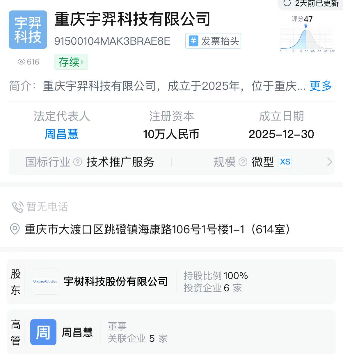 上证报中国证券网讯(章林 记者 徐锐)2026年初,中国机器人领军企业宇树科技股份有限公司(以下简称“宇树科技”)正式在重庆市大渡口区设立全资子公司——重庆宇羿科技有限公司(以下简称“重庆宇羿科技”)。天眼查信息显示,该公司已于2025年12月30日完成注册,标志着这家全球足式及人形机器人头部企业全面进军西南市场,进一步完善其全国化产业布局。