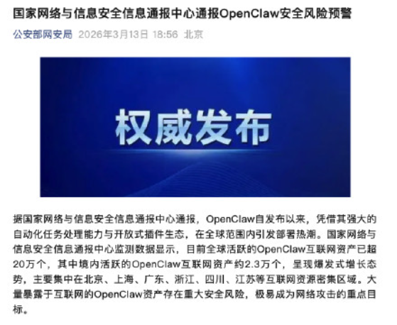 如果说成本问题是用户“用不起”的障碍,那么安全风险则是用户“不敢用”的根本原因。国家网络与信息安全信息通报中心的通报明确指出,OpenClaw在架构设计、默认配置、漏洞管理、插件生态、行为管控等方面存在较大安全风险。