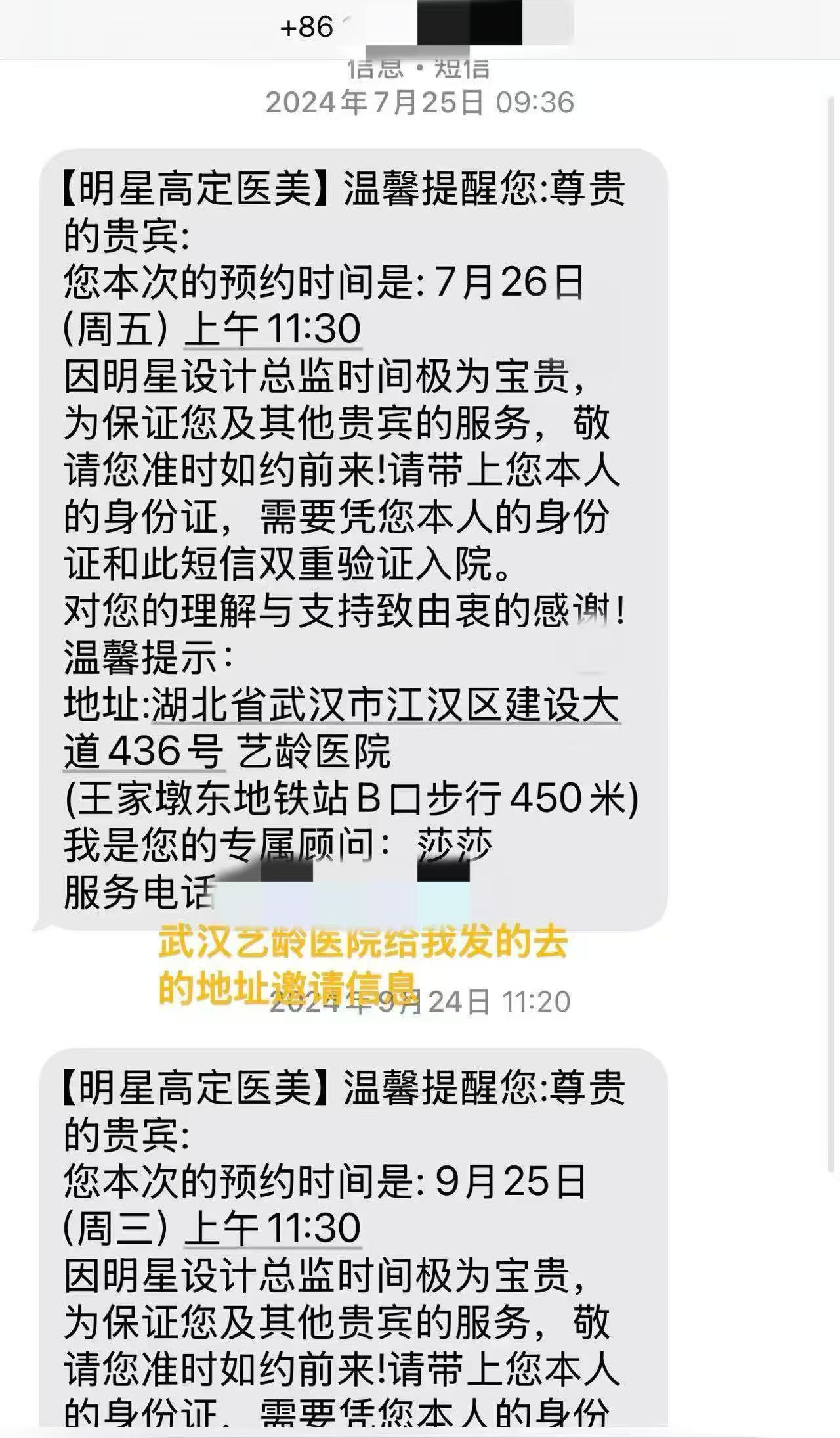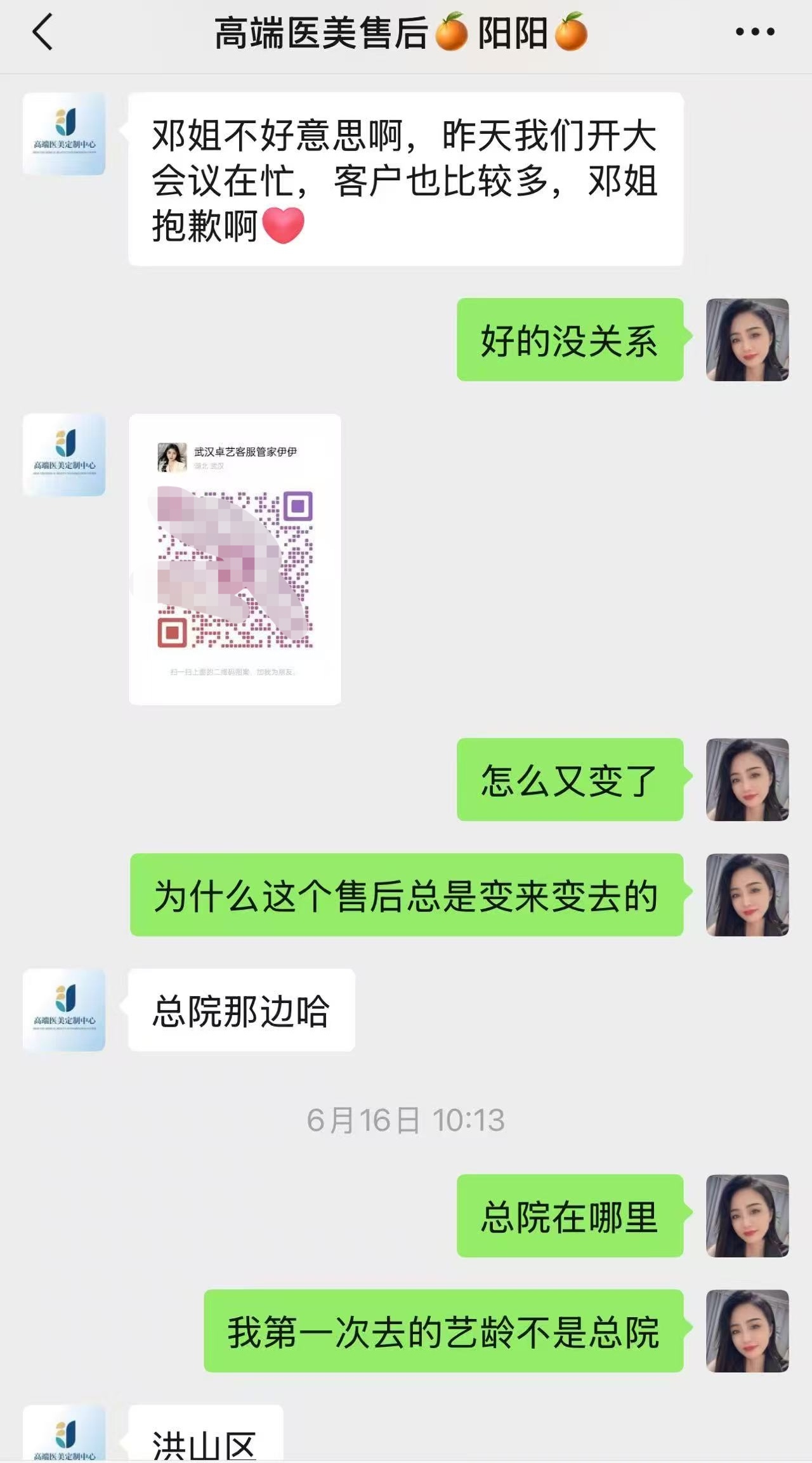 邓女士提供的短信、聊天记录中,不同的客服人员多次发送武汉艺龄、武汉恒美、武汉悦颜、武汉卓艺等整形机构地址,在邓女士抱怨“总是换地方”之后,她们以“总院”“分院”“汉阳院区”“客户现在由总院统一管理”“专家现在在总院坐诊”“几家医院轮流安排”等措辞解释。