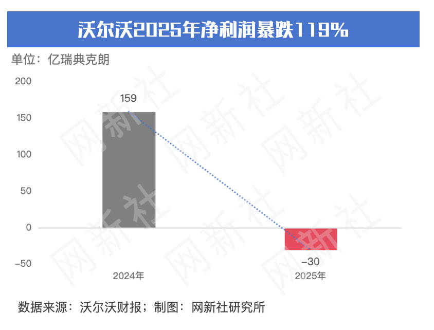 财报显示,2025年全年,沃尔沃总营收为3573亿瑞典克朗(约2713亿人民币),同比下滑11%,主要受宏观经济下滑和汽车销量下降的影响。而利润端的情况则更严峻,沃尔沃2025全年,净亏损为29.68亿瑞典克朗,相较于2024年159.34亿瑞典克朗的盈利,同比暴跌119%,出现大幅转亏。公司管理层表示,利润下滑的主要原因,来自于平台减值等一次性因素影响,