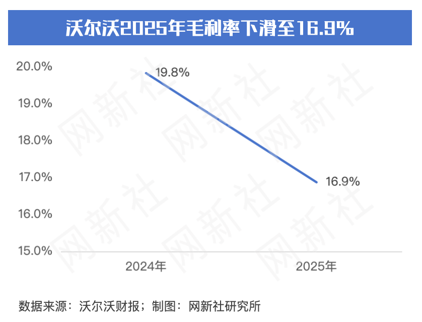 然而,剔除资产减值等一次性影响后的经营利润为125.56亿瑞典克朗,同比下降48%,同样显示出,沃尔沃的盈利能力面临巨大压力。从毛利率来看,沃尔沃2025年整体毛利率为16.9%,相较于2024年的19.8%,也出现了明显的下滑。公司表示,毛利率的下降,主要受销量下滑,定价策略和美国关税等多重负面因素的影响。