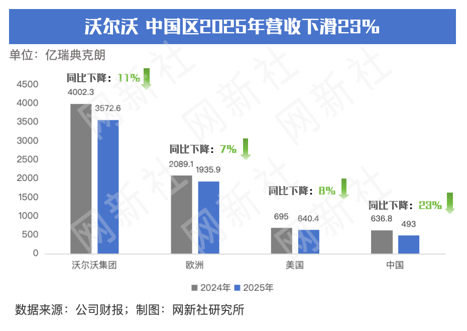 在中国价格战和竞争加剧的市场环境下,中国区的营收业绩下滑压力更为明显,2025年沃尔沃中国营收493亿瑞典克朗(约374亿人民币),同比下滑23%,相较于欧洲和美国市场营收同比下滑7%和8%, 中国市场成为沃尔沃在全球范围内,营收下滑最严重的市场。