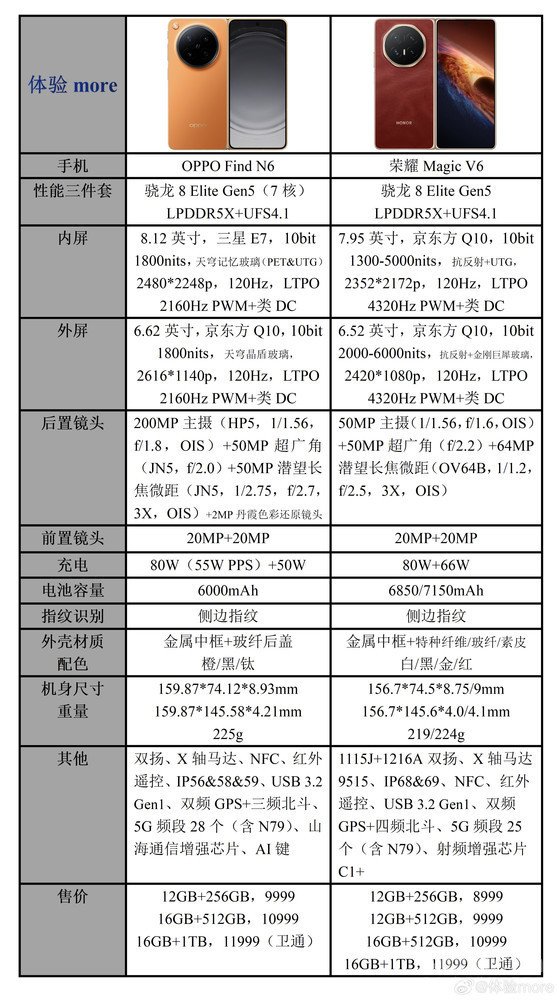 【CNMO科技消息】3月17日,OPPO Find N6正式发布正规在线炒股配资知识门户,博主“体验more”将其配置与此前发布的荣耀Magic V6进行了对比,具体对比信息如下: